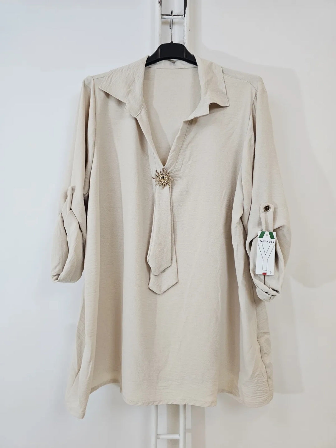 Découvrez la Blouse Cravate, une pièce fluide et élégante qui s'adapte à toutes les morphologies jusqu'au 46. Son effet cravate avec broche soleil ajoute une touche d'originalité, tandis que les manches relevables vous offrent une polyvalence au quotidien. Offrez-vous le chic naturel que vous méritez !