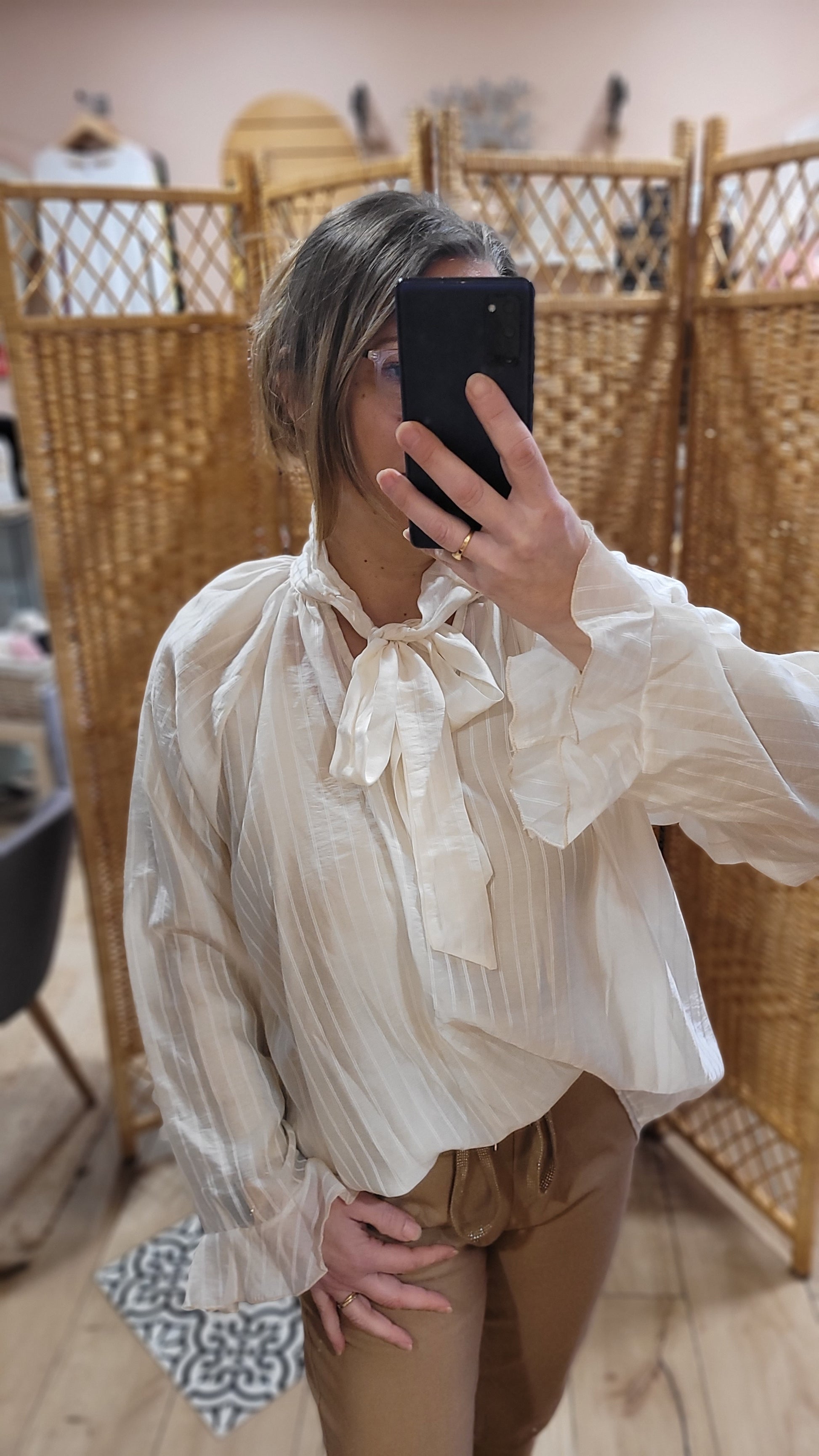 Découvrez la Blouse Rosa, une pièce incontournable qui allie élégance et confort ! Avec son motif rayé et sa taille unique allant jusqu'au 44, elle sublime toutes les silhouettes. Le nœud à nouer au col apporte une touche romantique, tandis que sa texture vaporeuse vous garantit une allure légère et aérienne. Adoptez ce style chic et intemporel !