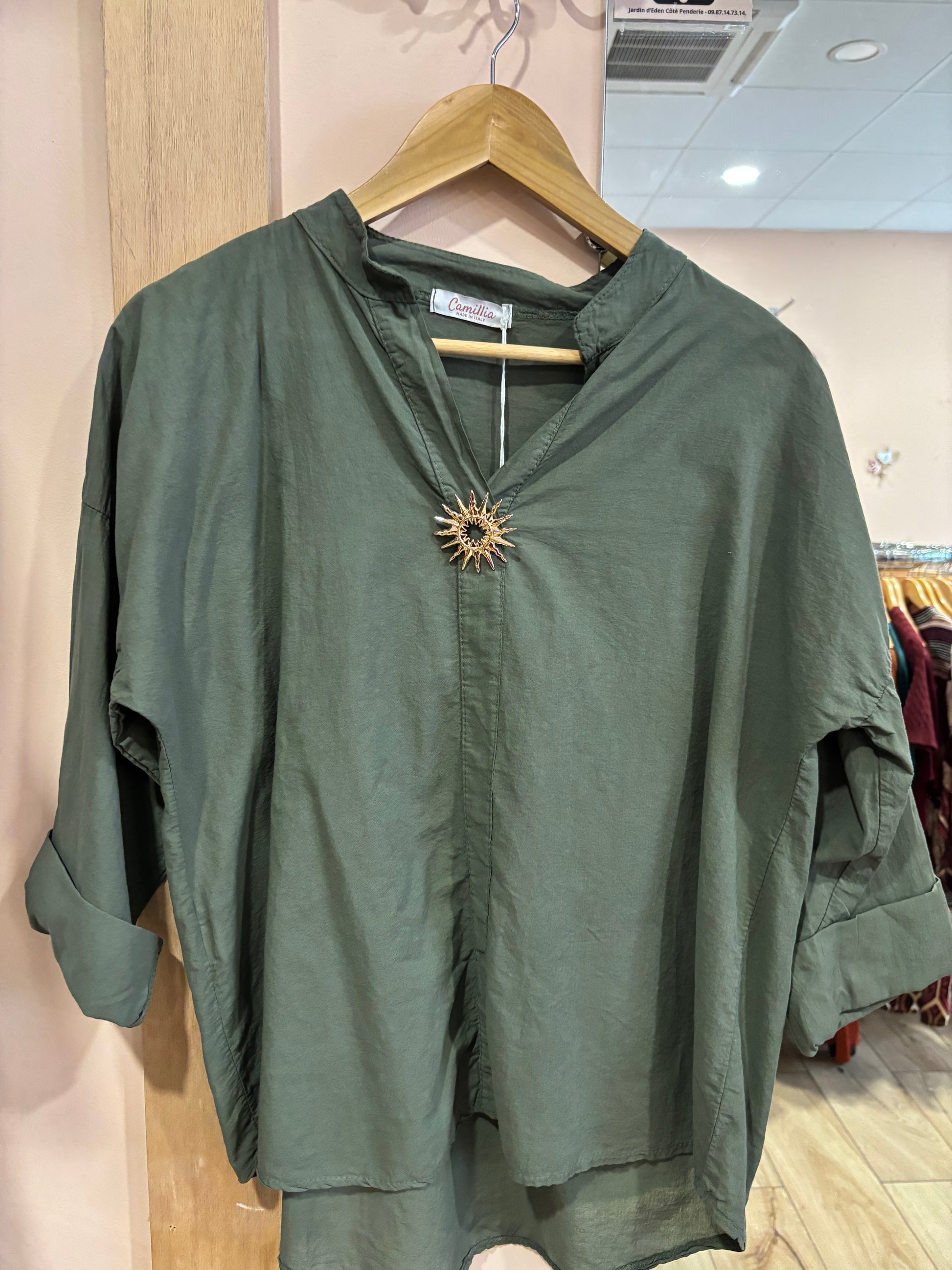 La blouse Sun est à la fois élégante et intemporelle avec son col en V et ses détails dorés en forme de soleil. Grâce à sa taille unique, elle convient parfaitement aux tailles 42 et 44. Son ourlet plus court à l'avant et plus long à l'arrière ajoute une touche de sophistication à cette pièce versatile.