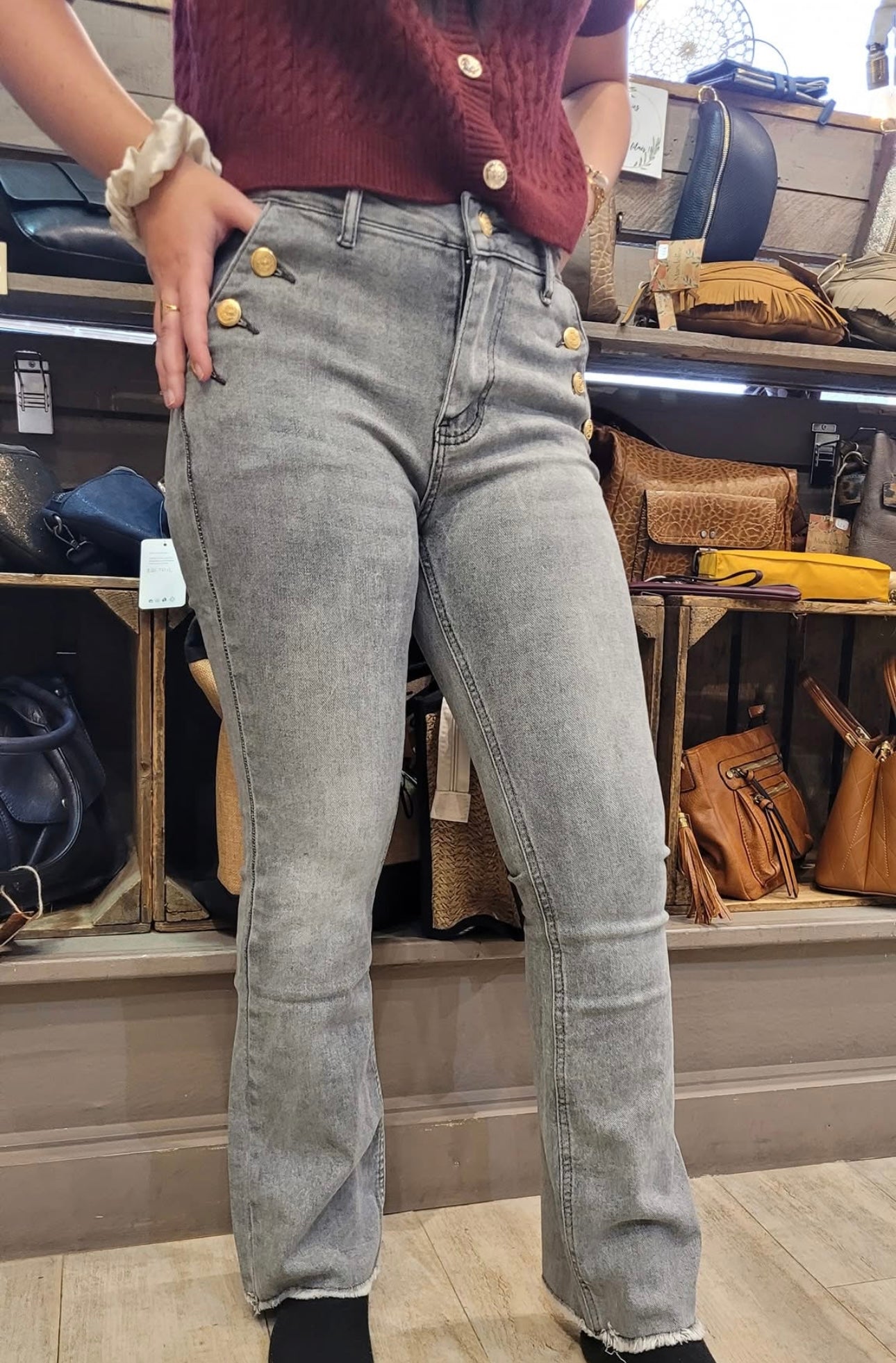 Découvrez notre jean gris élégant, avec bouton doré ornant ses poches. Ce pantalon à taille normale assure un ajustement parfait lorsqu'il est porté à votre taille. Alliez style et confort avec le jean Audrey.