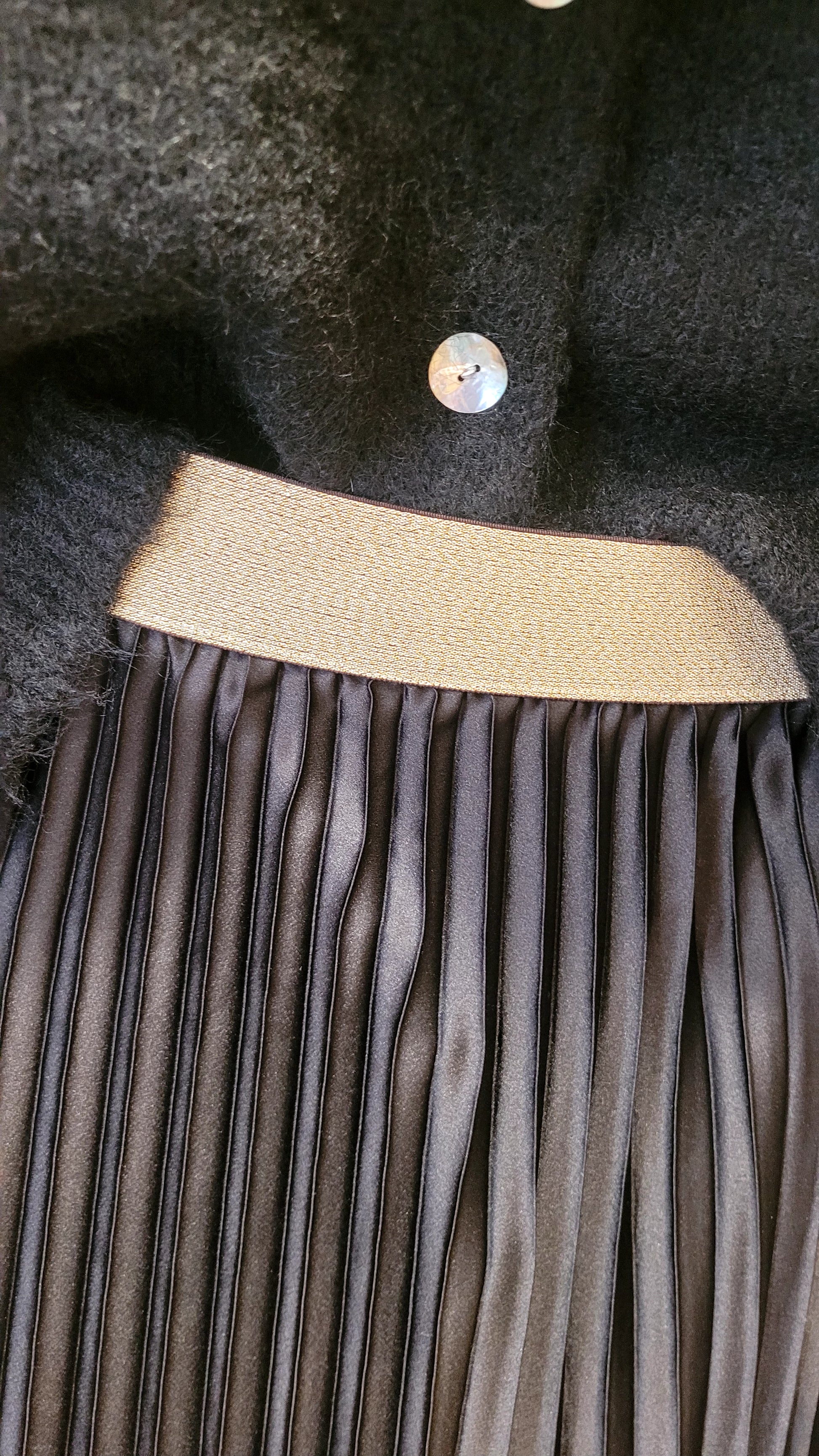 Découvrez la jupe plissée, un incontournable de votre garde-robe! Avec sa taille unique allant jusqu'au 44/46, elle s’adapte parfaitement à votre silhouette. Son élégante taille élastique dorée et son effet satiné apportent une touche de luxe à votre style. Élevez votre allure avec cette pièce versatile.