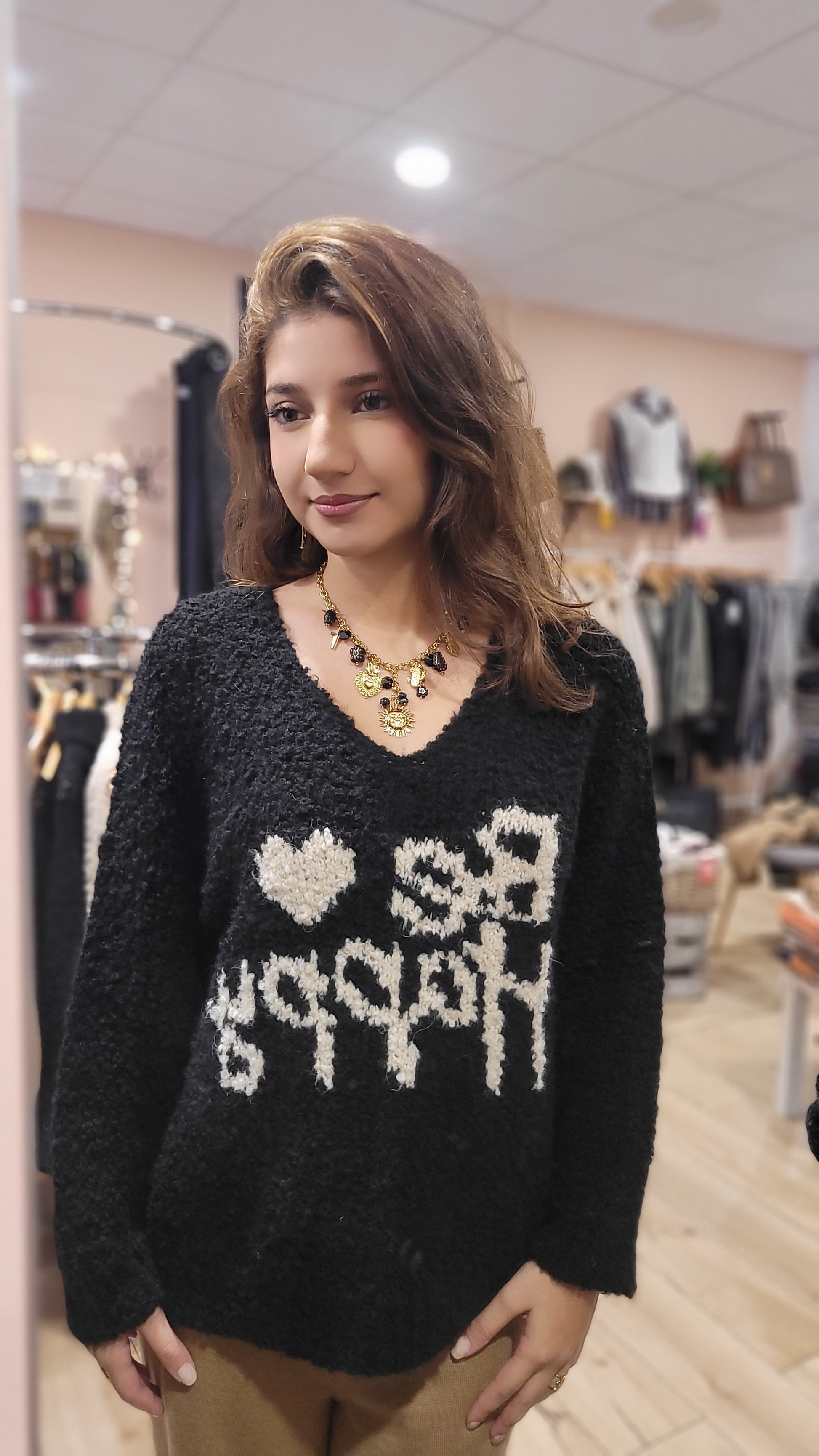 Exprimez votre joie de vivre avec notre Pull Be Happy ! Taille unique jusqu'au 42, il vous accompagne dans votre bonheur avec son inscription "be happy" en style bouclette. Son col v ajoutera une touche élégante à votre tenue. Commandez maintenant pour répandre la positivité autour de vous.