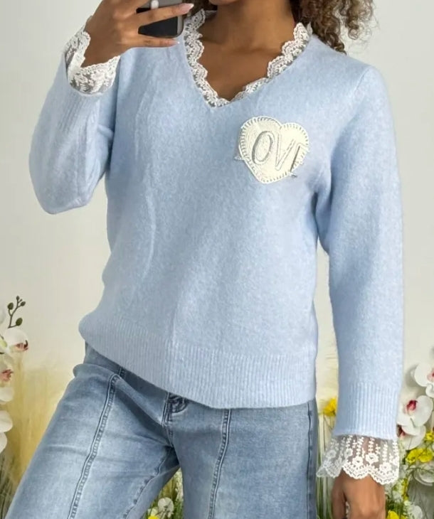 Découvrez le confort et la féminité du Pull Clara ! Avec son col en V et ses bords en dentelle, il apporte une touche élégante à votre tenue. Taille unique jusqu'au 42/44, les bas de manches en dentelle et le cœur brodé ajoutent des détails romantiques. Profitez du style et de la douceur en même temps !