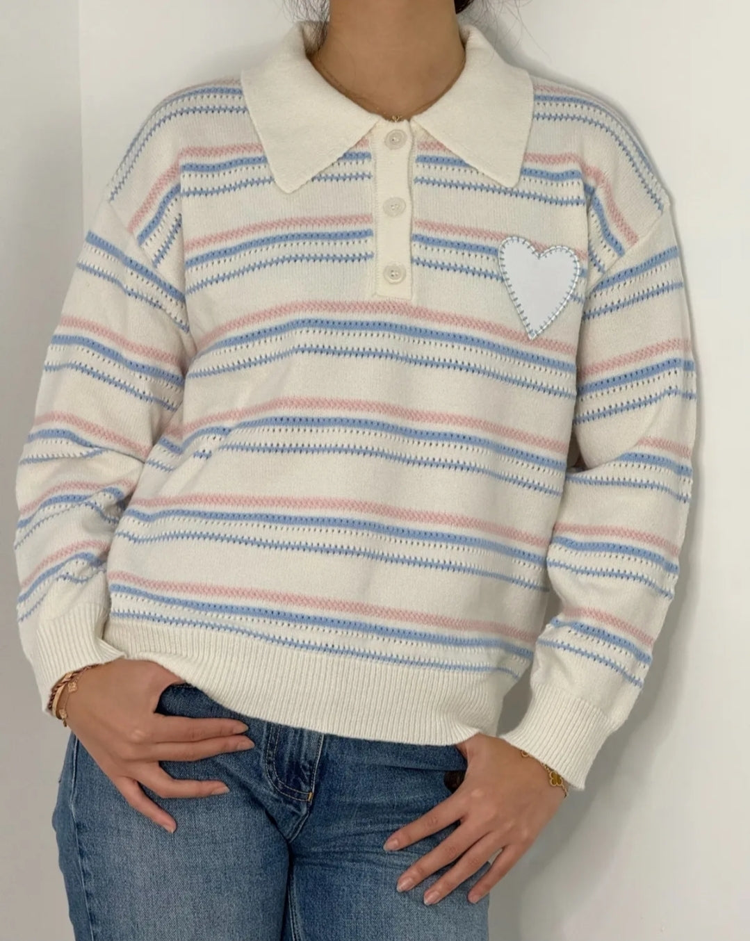 Ce pull polo est parfait pour les fashionistas de taille unique jusqu'au 42/44. Avec son col boutonné et son motif rayures et coeur, il allie style et confort pour toutes les occasions. Ne passez pas à côté de ce véritable coup de coeur !